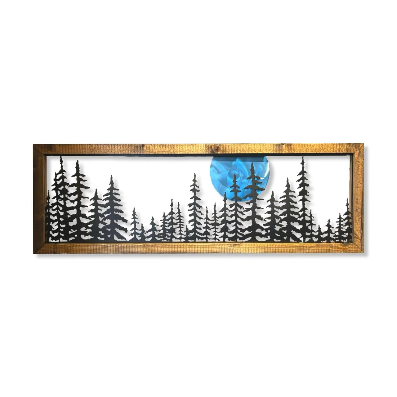 Our wood frames are made from spruce wood that is first stained with decking stain, then left outside for up to 2-years, stained again, framed and then stained a third time. This gives them a rustic appeal and also means that they can be hung outside if desired.